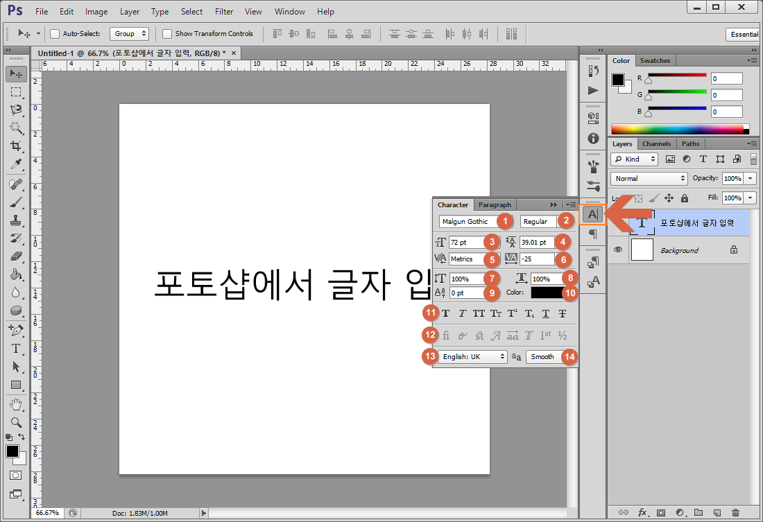 Character 패널에서 폰트 종류/크기/색상/글자 간격/줄 간격 등의 다양한 설정을 할 수 있습니다.