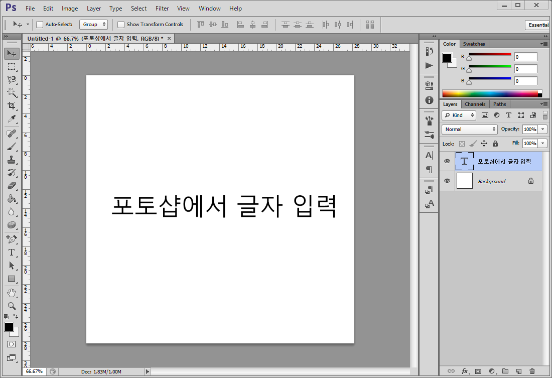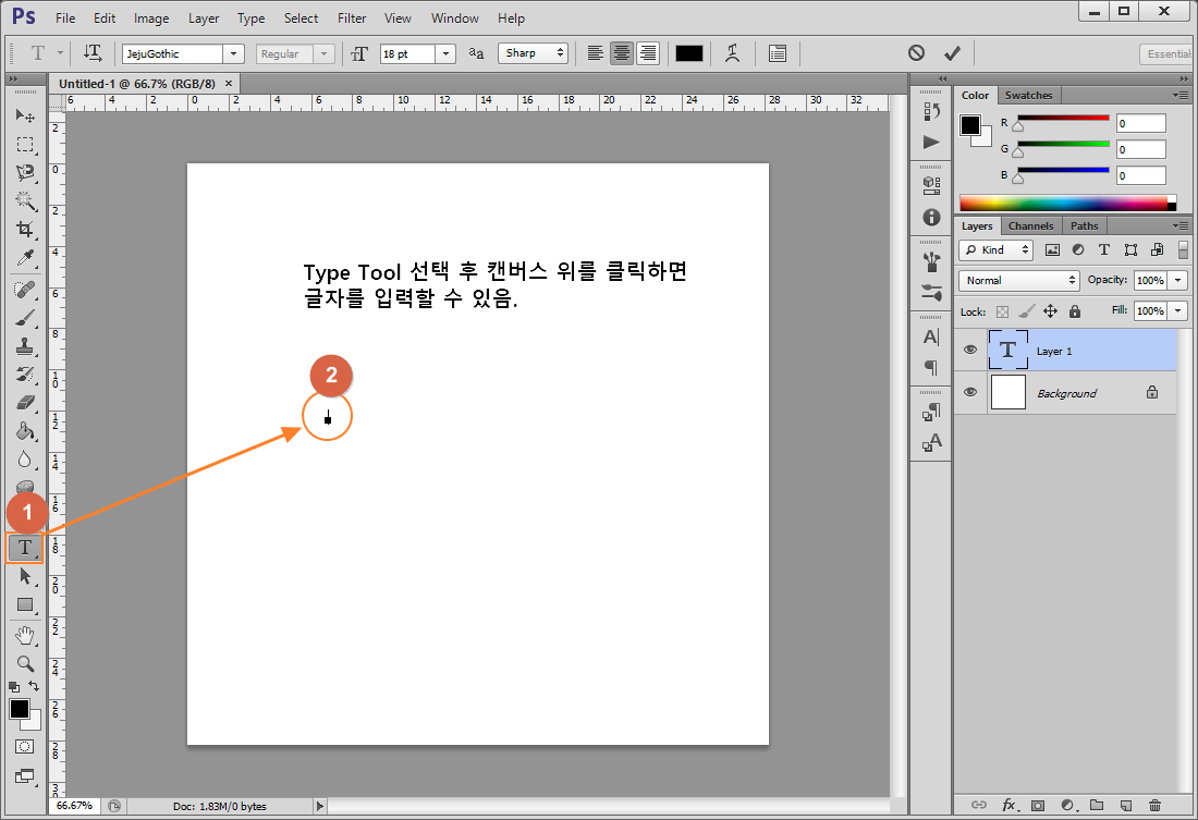 글자를 입력하기 위해 타입툴로 캔버스를 클릭하면 문자 레이어가 자동으로 만들어집니다.