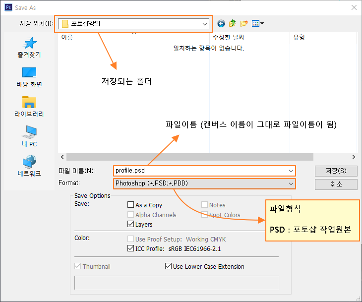 저장되는 파일 이름은 처음 캔버스 만들 때 넣어준 profile이란 이름의 PSD 파일로 저장되며 최종 이미지 파일인 JPG, PNG, GIF 등으로 저장하기 위해서는 Save As (Shift+Ctrl+S)를 하면 됩니다.