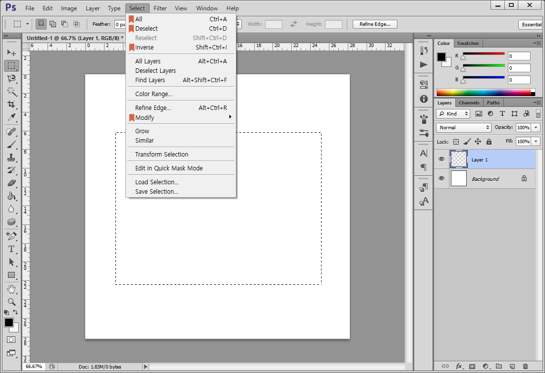 이 메뉴의 대부분 기능은 상단 Option 패널과 왼쪽의 기능별 패널에서 버튼식으로 제공해 주고 있어서 사실, 메뉴를 눌러서 사용하는 경우는 별로 없습니다.