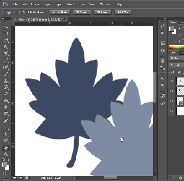 편집 중에 세밀한 작업을 위해 캔버스를 확대하였을 때 화면에 보이는 영역이 좁아서 불편한 경우가 있습니다. 이때 손바닥 도구를 선택하고 마우스 왼 클릭 상태에서 드래그하면 캔버스 전체를 이동시켜 작업 영역을 쉽게 화면 안으로 옮겨올 수 있습니다.