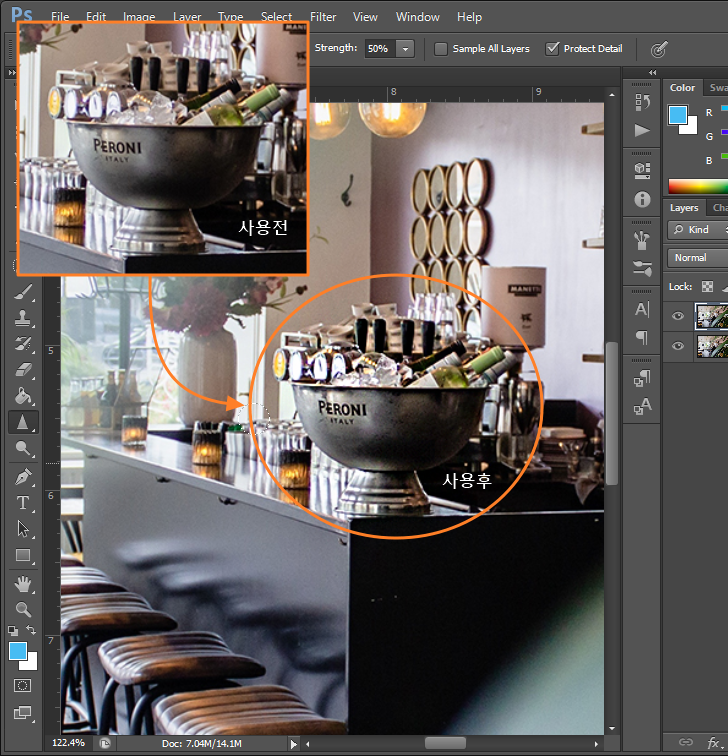 마우스 좌 클릭하면 처음 지정해 둔 곳을 복사/붙여 넣기 하는 것 처럼해서 덮어줍니다. 자세히 보면 흔적을 발견할 수 있어서 조금 섬세함을 요구하는 도구입니다.