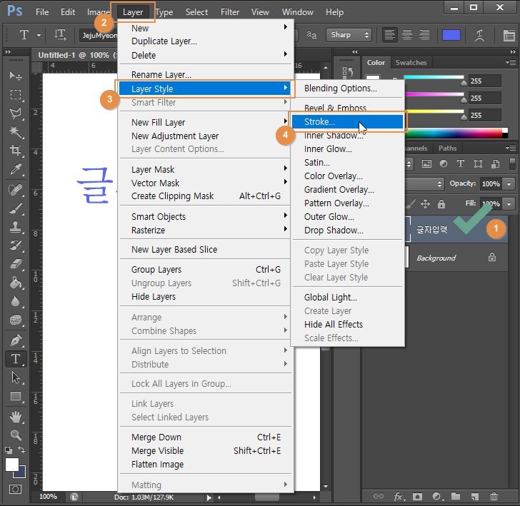 ① 글자 레이어가 선택되어 있는 상태에서 ② Layer 메뉴 - ③ Layer Style - ④ Stroke 선택