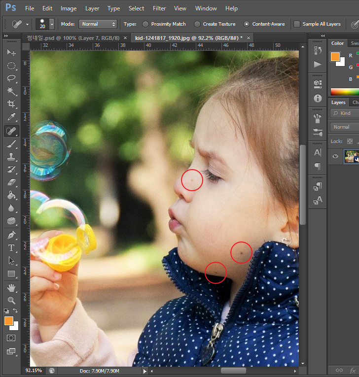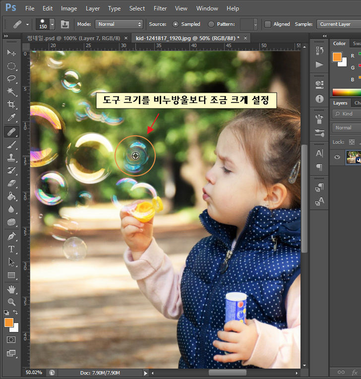 Healing Brush Tool은 그려 넣기도 가능합니다. 지정한 곳을 복사해서 덮어 씌우는 역할을 하기 때문에 가능한데요, 아래 사진 속 아이가 비눗방울 놀이를 하고 있으니 비눗방울을 좀 더 추가해 볼까요?