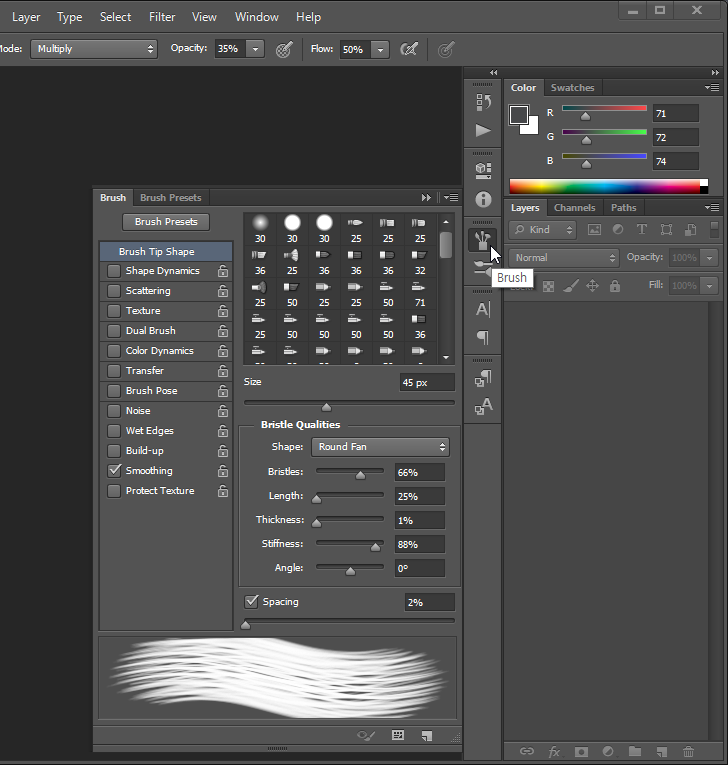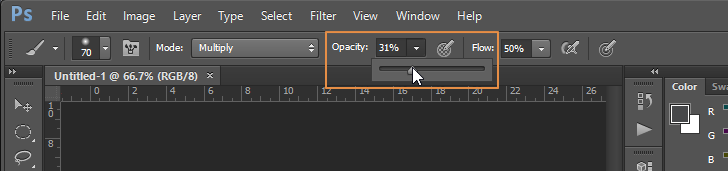 어떤 브러시를 어디에 어떻게 사용하는지에 따라 다르므로 적절한 값은 없습니다. 그러니 직접 사용해 보면서 작업에 필요한 투명도 값을 찾으면 됩니다.