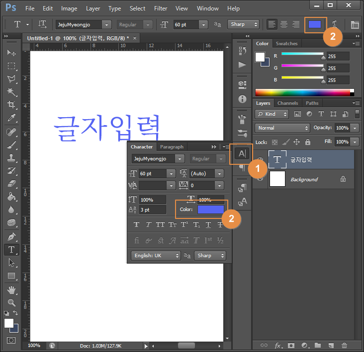 상단 Option Bar 또는 Character 패널에서 Color를 클릭합니다.