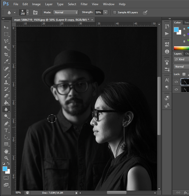 이 도구는 그냥 점 부분에서 마우스 좌클릭만 해 주면 되며 원 안 쪽을 주변과 어울리게 수정해 줍니다. 원의 크기는 '[' 키와 ']' 키를 이용해서 조정 가능합니다.
