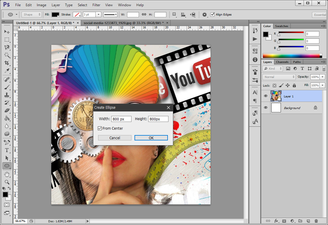 원형도구를 선택하고 캔버스 부분을 클릭하면 아래와 같이 Create Ellipse 창이 뜹니다.