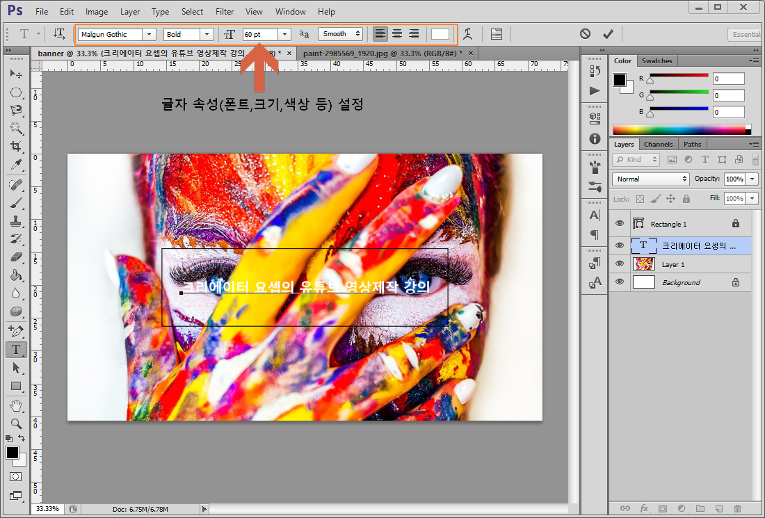 아래와 같이 글자를 입력하고 폰트, 크기, 색상들을 지정해 주었습니다.
