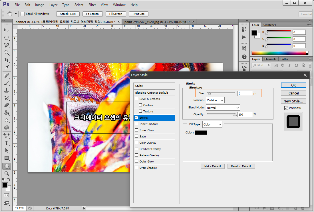 레이어 스타일창의 Stroke(스트로크/테두리) 값을 적당히 조정해서 테두리를 만들어 줍니다.
