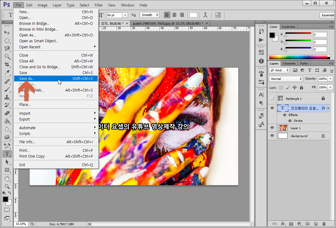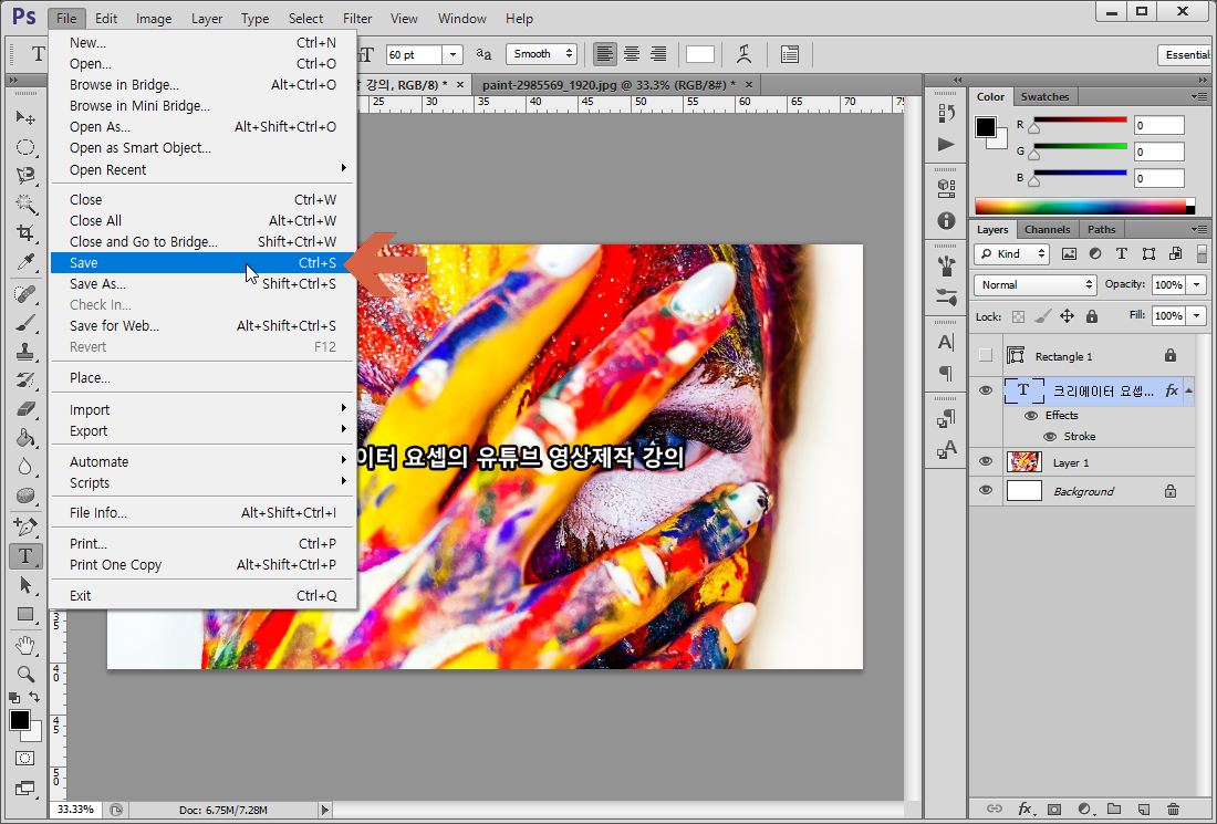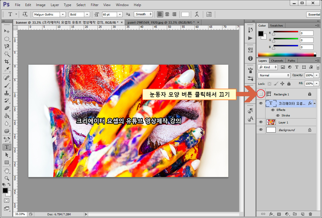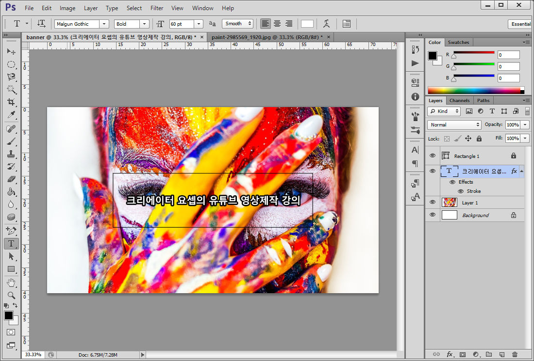 글자의 테두리는 레이어 스타일 기능을 이용해서 만들 수 있습니다.