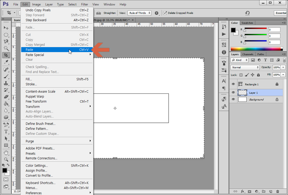 Edit 메뉴에서 Paste 선택 또는 단축키 Ctrl+V 누름