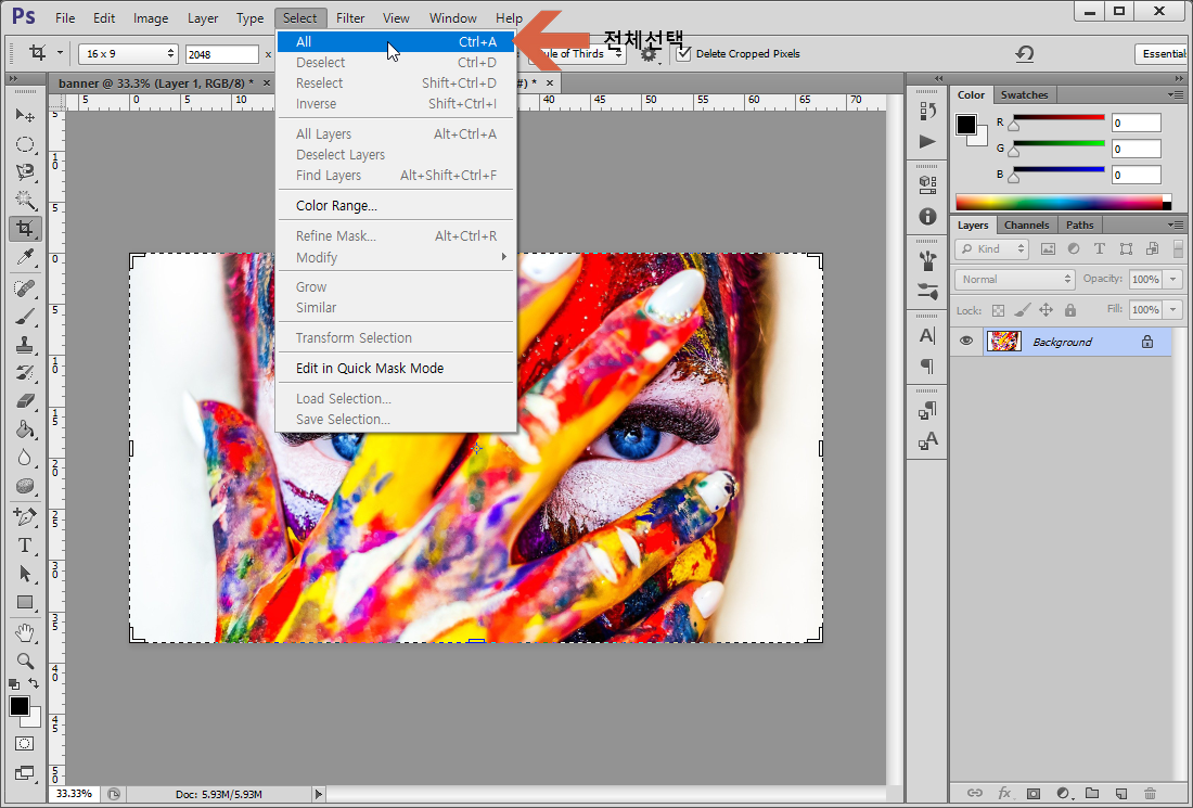Select 메뉴에서 All 선택 또는 단축키 Ctrl + A 누름