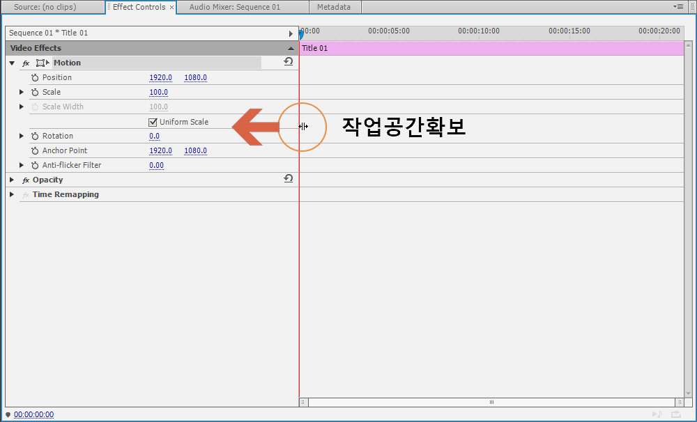 위 Effect Controls의 Motion 항목에서 Position 부분을 조정하게 되는데요, 먼저 아래와 같이 Effect Controls 패널에서 작업 영역 공간을 충분히 확보해 주세요.