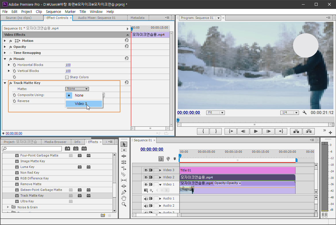 Effect Controls 패널에 추가된 Track Matte Key 항목의 Matte 를 Video 3으로 바꿔줍니다.