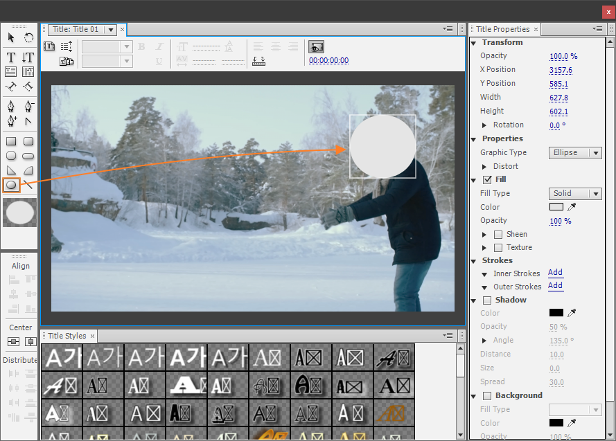단축키 Ctrl + T 키를 눌러 타이틀러를 연 다음 Ellipse Tool(E) (일립스 툴)을 이용해서 남자의 얼굴을 다 가릴 정도의 큰 원을 그립니다.